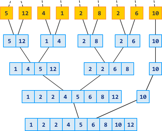 폰 노이만: 1개의 원소를 가진 정렬된 리스트 9개 → 정렬된 리스트를 합병 → 정렬